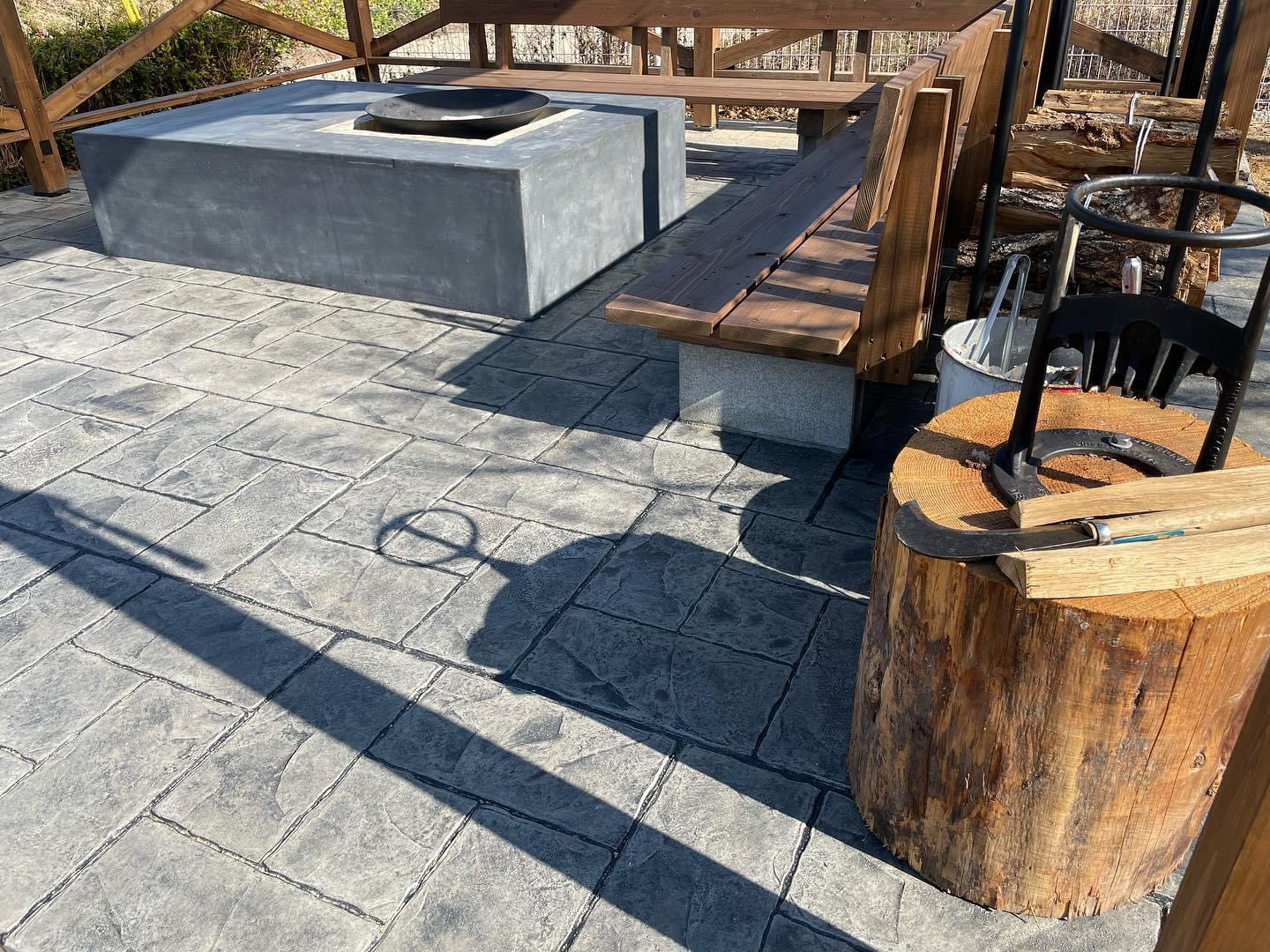 スタンプコンクリートの特徴は、木目・石畳み・岩肌・枕木といった多種多様な表現ができることです。つくりたい屋外スペースの雰囲気や、ファイヤーピットに合わせたデザインができます。また、自然素材のように美しい仕上がりでありながら、タイルと比較すると価格を押さえられるのも大きなメリットでしょう。