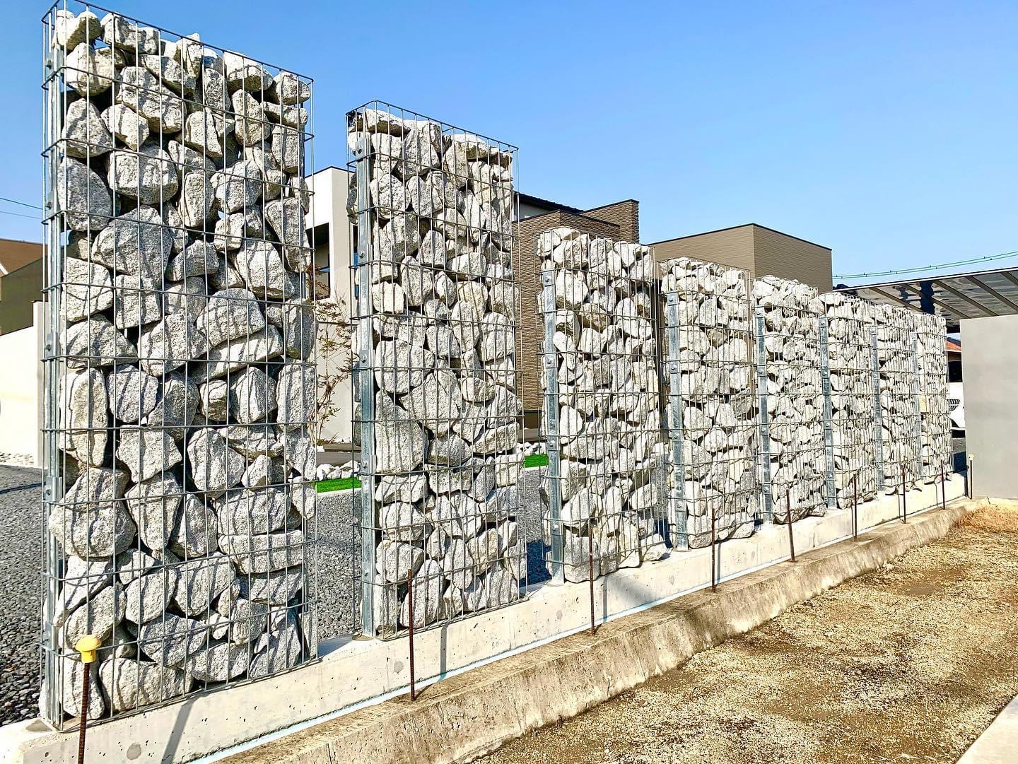 ガビオンとは、鉄やアルミなどの丈夫な素材をカゴ状に組み立て、その内部に天然石や砕石を詰め込んだ構造物のことです。ブロック塀の代わりとして外構を取り囲むように設置されるのが一般的です。シンプルな作りですが、ガビオンならではの素材の質感や天然石の独特な風合いが空間におしゃれさを加えてくれます。