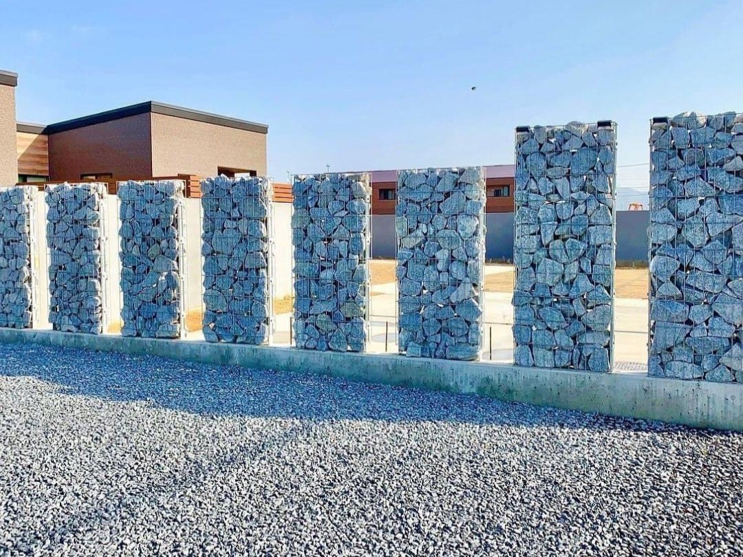 金網の上から下まで隙間なく石を埋める方法は、迫力や重厚感のある外構に仕上げたい場合に向いています。たとえば、目隠しフェンスや門柱をガビオンにし、金網内部を石で埋めると、外構全体に存在感が生まれます。また、石がしっかり敷き詰められている分、石のサイズや形状をそろえるとさらに整った印象になり、洗練されたおしゃれな外構に仕上がるのが特徴です。直線的なデザインの住宅やモダンな外観とも相性が良く、外構の主役として配置したい場合にも適しています。