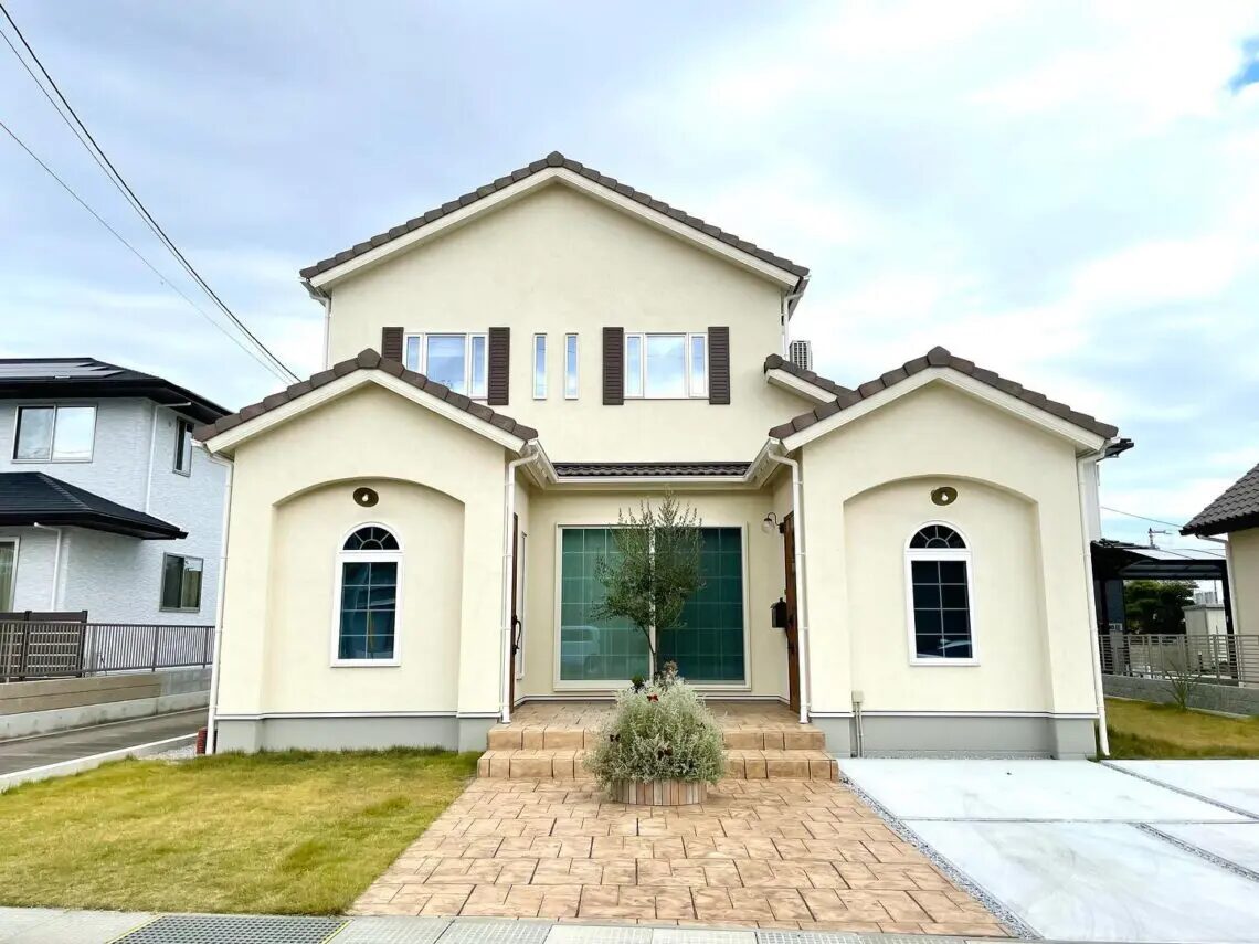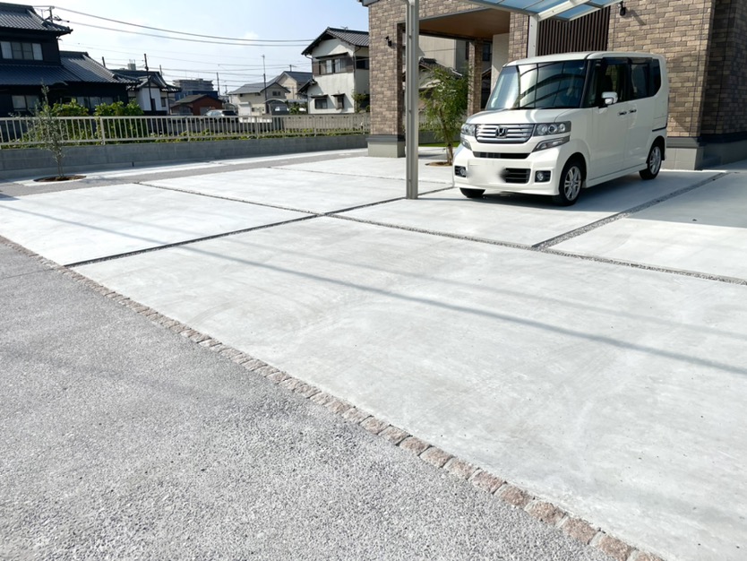 駐車場部分のみに土間コンクリートを施工し、外構全体では複数の素材を組み合わせた事例です。必要な場所にだけコンクリートを使うことで、機能性とデザイン性のバランスを取っています。明るめの土間コンクリートが、落ち着いた色合いのアプローチや芝生と自然になじみ、全体に上質で洗練された印象を与えています。素材同士のコントラストが強すぎないため、どこか海外住宅のような雰囲気を感じられる点も魅力です。